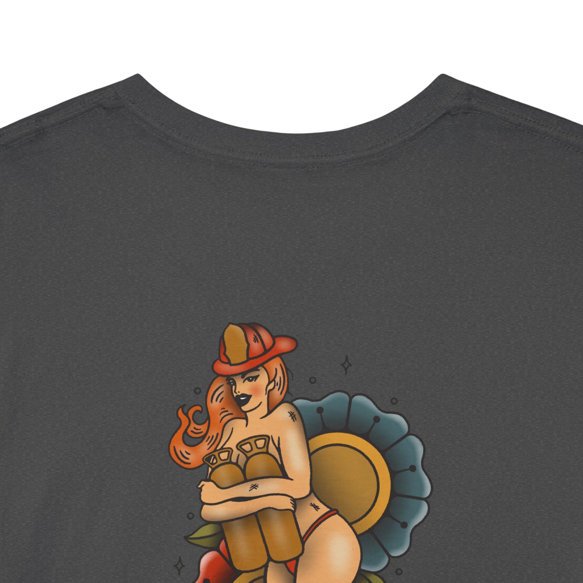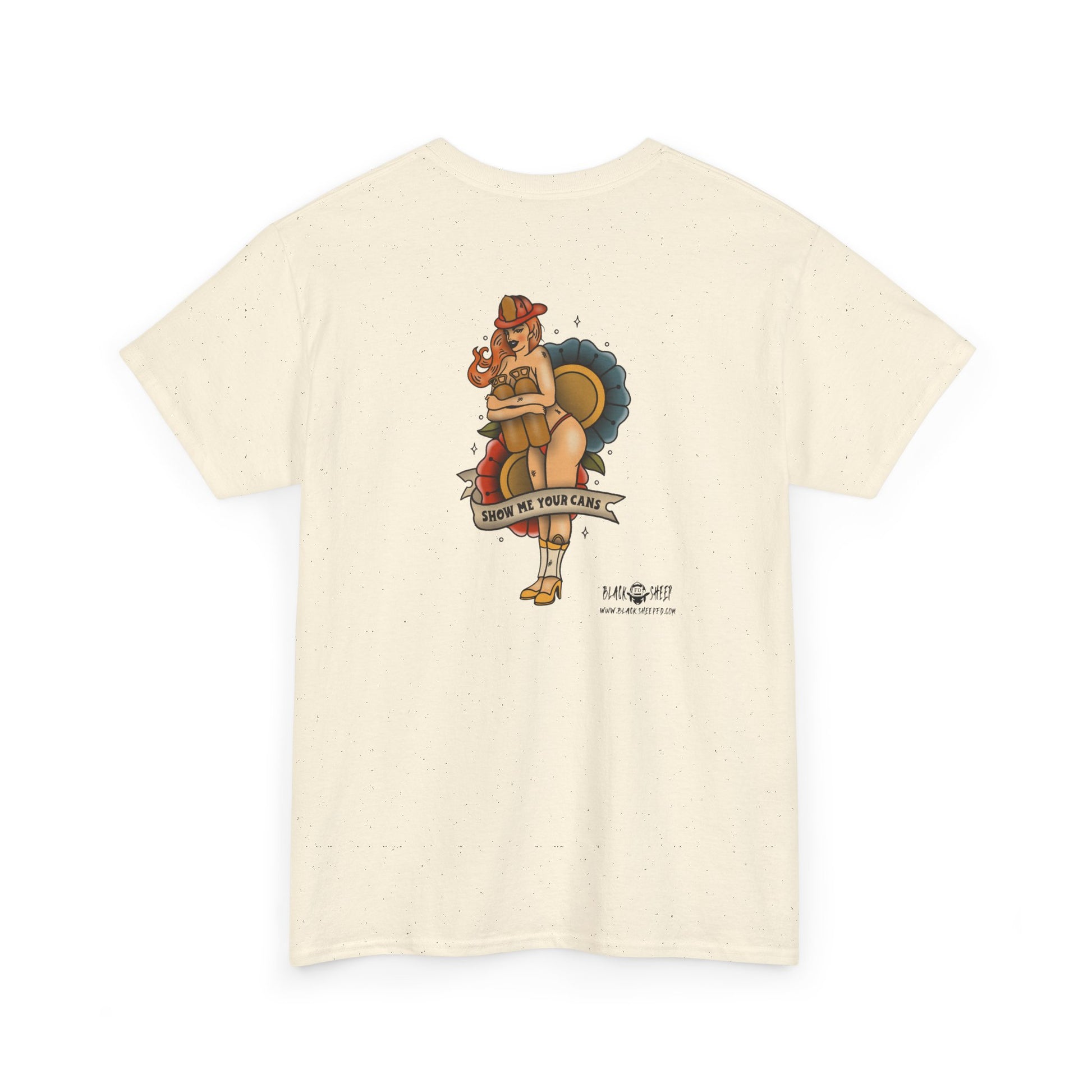 This soft, sturdy tee carries a vintage pin-up vibe with a playful, nostalgic illustration on the back that is slightly sexy but still classy. Subtle yet edgy. Do you dare call em out to "Show them cans?"